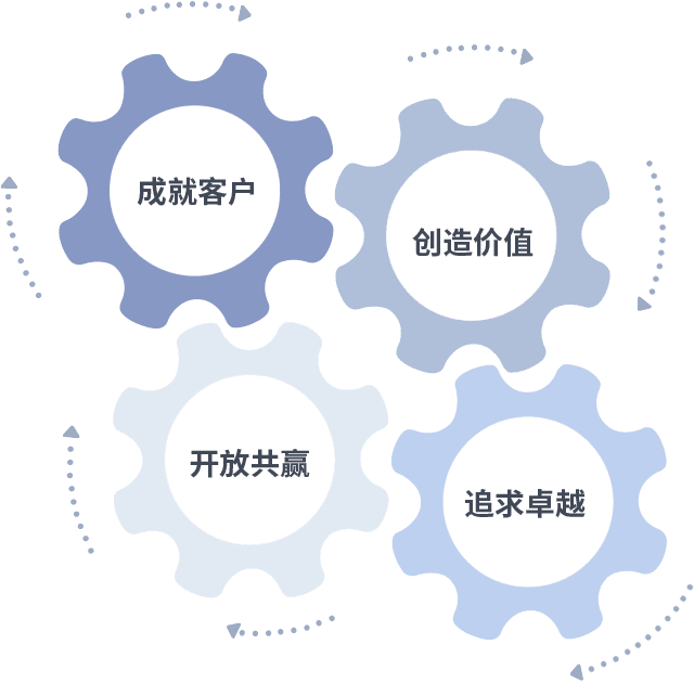 成就客户是一切决策的出发点,,创造价值是衡量所有工作的标准,,,追求卓越是我们做事做人的态度,,,开放共赢是我们的格局也是最终的结果。。。。价值观的齿轮环环相扣,,,推动着组织里的每个人不断向前。。。