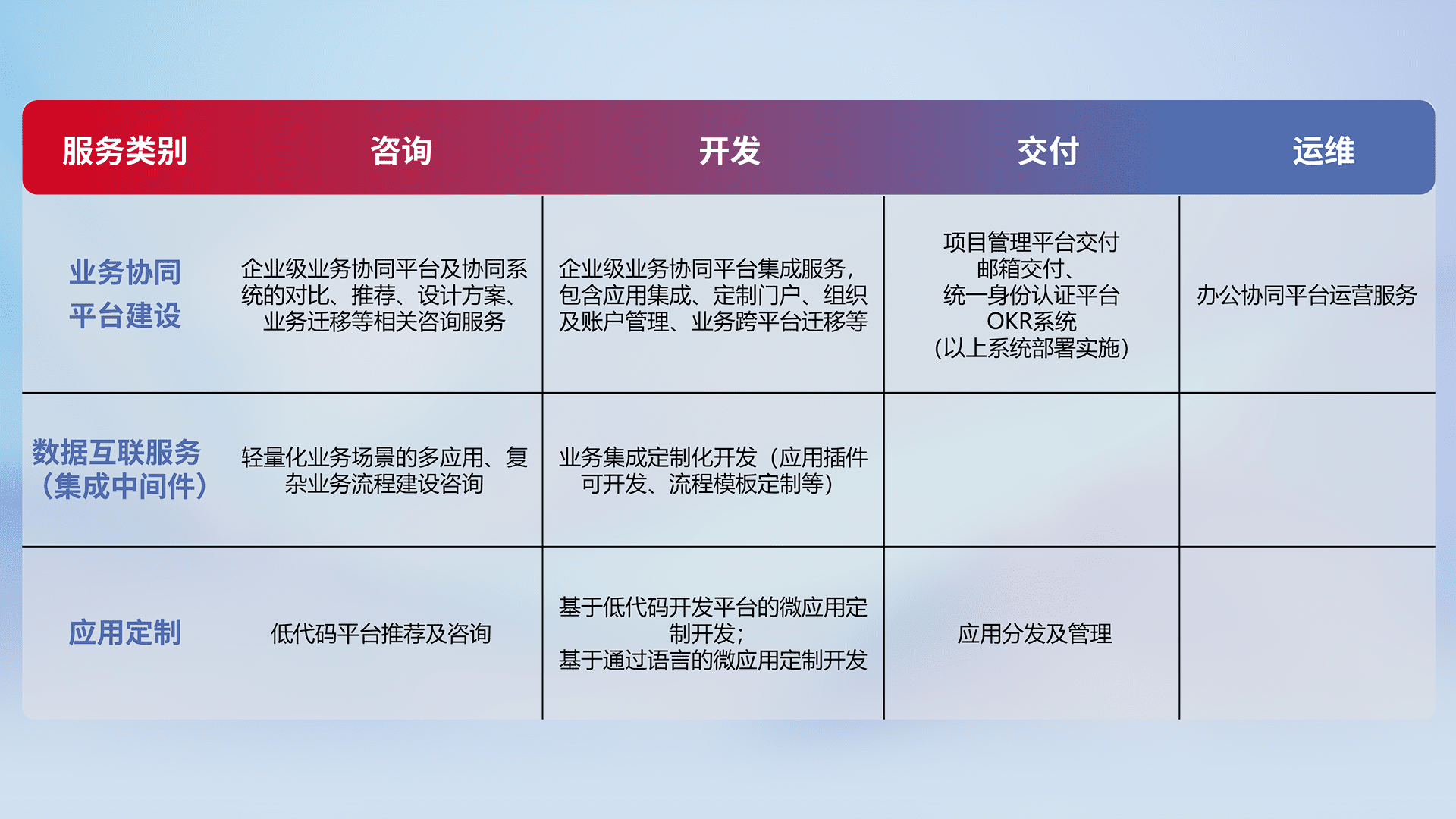 针对钉钉、、企微、、IDaas等平台级产品提供产品的规划、、、、方案、、、、交付、、、定制化开发等服务,,实现如统一协同办公、、智能客户服务、、混合会议管理、、、、智能数据查询、、、、等业务场景,,,实现数字化转型。。。